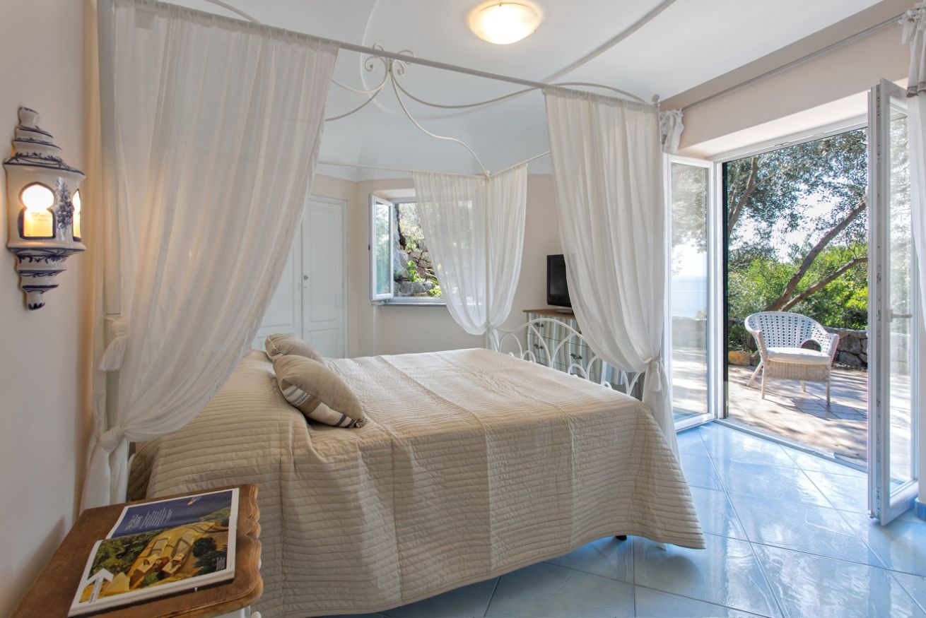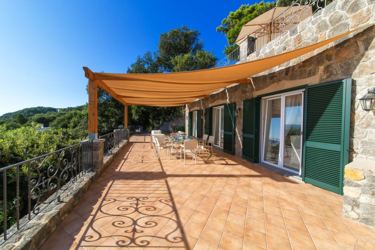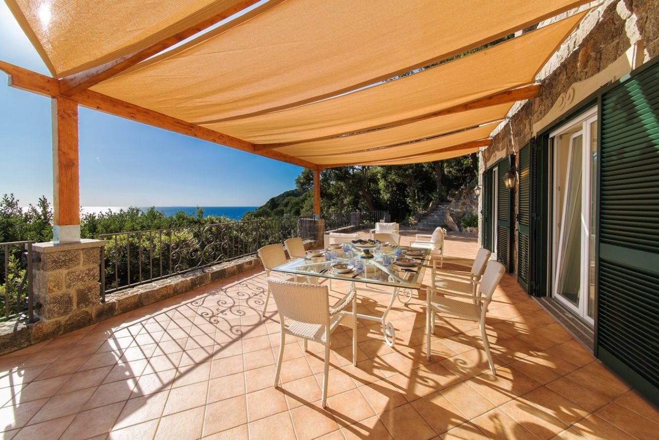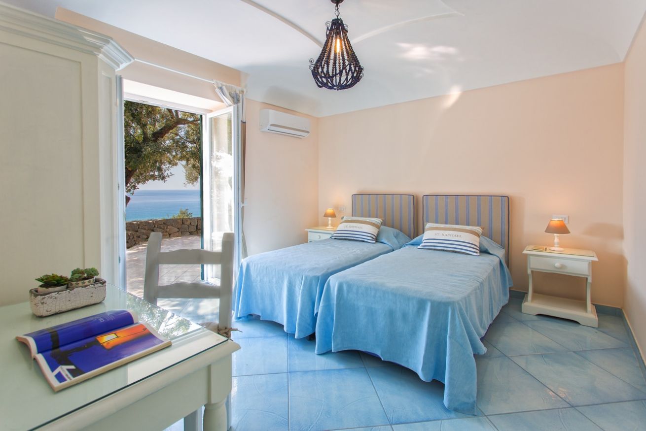 Villa Azzurra è incorniciata da fitta vegetazione e, con le sue ampie terrazze, si volge interamente verso il mare. La villa si sviluppa su due piani: al piano terra ci sono tre camere da letto con letti matrimoniali, due bagni con doccia e servizi.