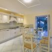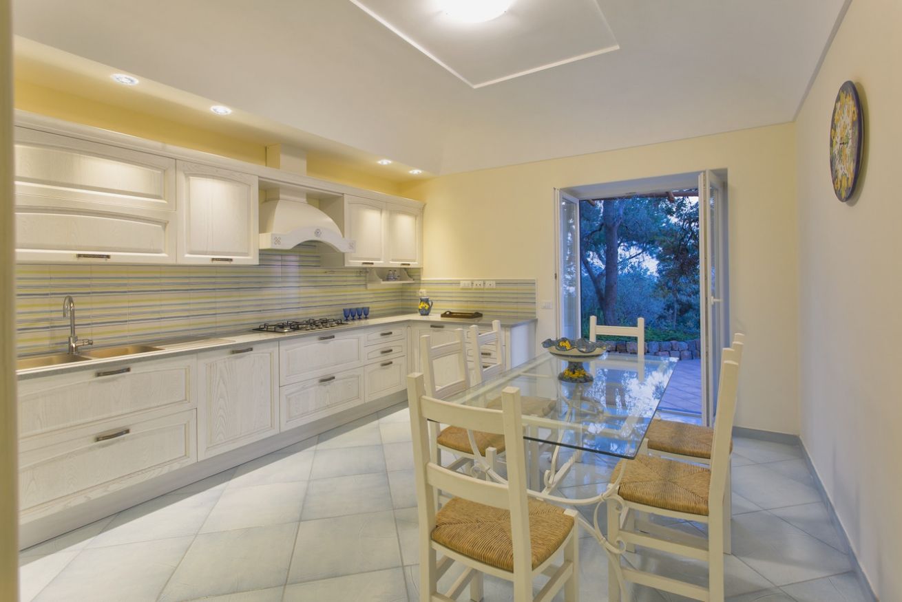 Al piano superiore si trova la porta d’ingresso che si apre su un doppio soggiorno con tavolo da pranzo, divani e televisione; l’interno della villa è completato da un bagno di servizio, lavanderia e una spaziosa cucina abitabile dotata di tutti gli elettrodomestici.